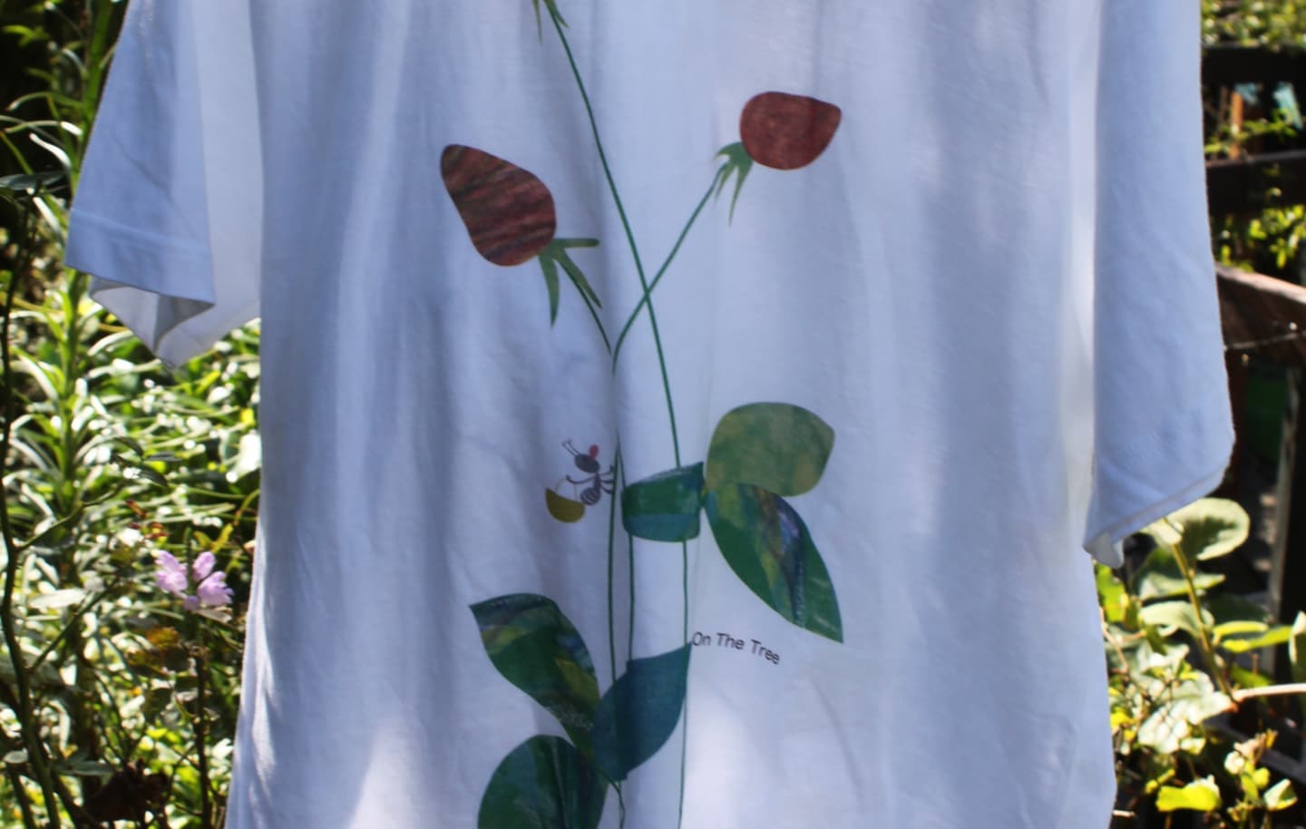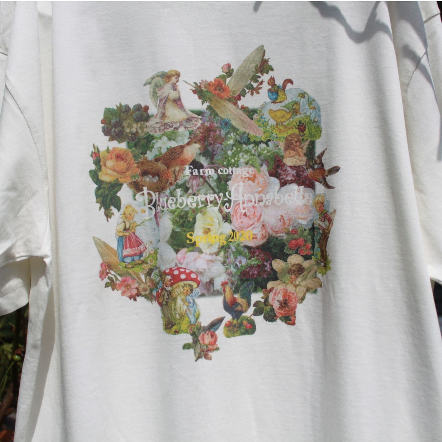 庭の花などを撮影し、コラージュして作りました。ダイレクトプリントなので布に馴染んだ自然な仕上がりで着心地もいいです。